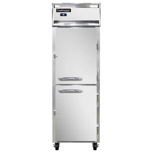 Enhance the heart of your restaurant with the Continental Refrigerator, 1RSNHD, Reach-In Refrigerator. This self-contained refrigeration unit is designed to meet the demands of a busy commercial kitchen. With its stainless steel front and aluminum interior and ends, it not only looks sleek but also ensures durability and easy cleaning. The shallow depth and half-height solid doors make it convenient to access and organize your ingredients and supplies. The electronic control with a digital display allows for precise temperature management, while the hi-low alarm alerts you if there are any fluctuations. The electric condensate evaporator eliminates the need for manual defrosting, saving you time and effort. With a 1/4 HP compressor, this refrigerator provides efficient cooling while remaining energy-efficient. Made in the USA and certified by cETLus and NSF, you can trust the quality and reliability of this Continental Refrigerator. Upgrade your restaurant's refrigeration system with the 1RSNHD and experience enhanced efficiency and performance.