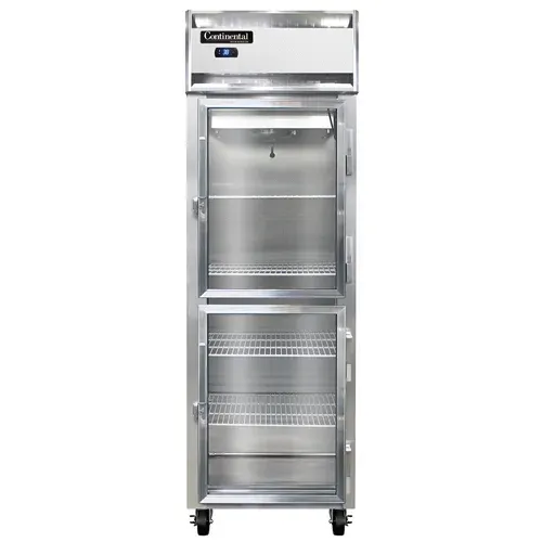 Introducing the Continental Refrigerator, 1RSNSSGDHD, Refrigerator, Reach-In - the perfect addition to drive restaurant profitability. This one-section reach-in display refrigerator is designed to optimize space and enhance efficiency in any commercial restaurant setting. With its shallow depth and narrow hinged glass half doors, this refrigerator offers easy access to your products while maximizing visibility for customers. The stainless steel exterior and interior ensure durability and easy cleaning, while the self-contained refrigeration system provides consistent cooling performance. The electronic control with a digital display allows for precise temperature management, while the hi-low alarm alerts you to any fluctuations. With a 1/3 HP compressor, this refrigerator is powerful enough to handle the demands of a busy kitchen. Made in the USA and certified by cETLus and NSF, you can trust the quality and reliability of this Continental Refrigerator. Drive your restaurant's profitability with this efficient and versatile reach-in refrigerator.