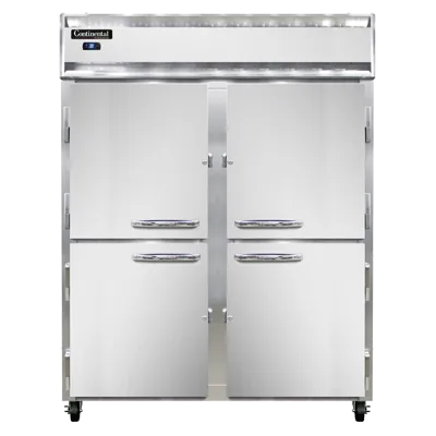 Maximize your food service potential with the Continental Refrigerator, 2RESNSSHD Reach-In Refrigerator. This extra-wide, two-section refrigerator is designed to meet the demands of a busy commercial restaurant. With a shallow depth and half-height solid doors, it provides easy access to your ingredients while saving space in your kitchen. The stainless steel exterior and interior not only give it a sleek and professional look but also make it durable and easy to clean. The electronic control with a digital display allows for precise temperature management, while the hi-low alarm ensures that your food stays at the optimal temperature at all times. Powered by a 1/3 HP compressor, this refrigerator is energy-efficient and reliable. Made in the USA and certified by cETLus and NSF, you can trust the quality and safety of this Continental Refrigerator. Upgrade your kitchen with the 2RESNSSHD Reach-In Refrigerator and experience enhanced efficiency and productivity.