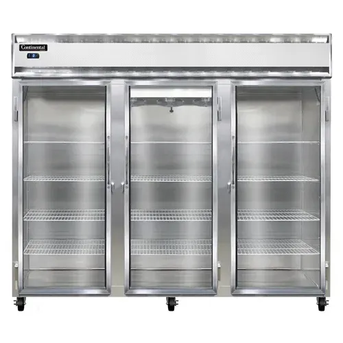 Discover kitchen perfection with the Continental Refrigerator 3FENSSGD Freezer, Reach-In. This extra-wide, three-section freezer is designed to meet the demands of a commercial restaurant. With its stainless steel exterior and interior, it not only looks sleek but also ensures durability and easy cleaning. The full-height glass doors provide a clear view of the contents, making it convenient to locate items without opening the doors frequently. The electronic control with a digital display allows for precise temperature management, while the hi-low alarm alerts you if the temperature goes outside the desired range. The electric condensate evaporator eliminates the need for manual defrosting, saving you time and effort. Made in the USA and certified by cETLus and NSF, this reach-in freezer guarantees quality and compliance with industry standards. Upgrade your kitchen with the Continental Refrigerator 3FENSSGD and experience the perfect blend of functionality and style.