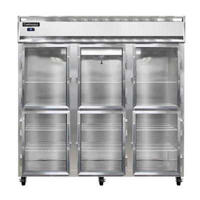 Boost your restaurant's performance with the Continental Refrigerator, 3RNSSGDHD, Refrigerator, Reach-In. This top-of-the-line refrigerator is designed to meet the demanding needs of commercial restaurants. With its stainless steel exterior and interior, it not only looks sleek but also ensures durability and easy cleaning. The narrow hinged glass half doors provide easy access to your stored items while keeping them visible for quick inventory checks. The electronic control with a digital display allows for precise temperature management, ensuring that your ingredients stay fresh and safe. The hi-low alarm alerts you if the temperature deviates from the set range, preventing spoilage and food waste. The electric condensate evaporator eliminates the need for manual defrosting, saving you time and effort. Powered by a 3/4 HP compressor, this refrigerator delivers reliable cooling performance. Made in the USA and certified by cETLus and NSF, you can trust the quality and safety of this Continental Refrigerator. Upgrade your restaurant's refrigeration system with the 3RNSSGDHD and experience enhanced efficiency and productivity.