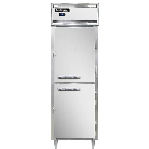 Mobilize your kitchen with the Continental Refrigerator D1RNSSHD Reach-In Refrigerator. This designer line refrigerator is perfect for commercial restaurant use, offering a spacious one-section design with a stainless steel exterior and interior for durability and easy cleaning. The standard depth cabinet and half-height solid doors provide convenient access to your ingredients and supplies. With self-contained refrigeration and an electronic control with a digital display, you can easily monitor and adjust the temperature to ensure your perishable items stay fresh. The hi-low alarm alerts you if the temperature goes outside the desired range, helping to prevent spoilage. The 6" stainless steel legs provide stability and make it easy to clean underneath the unit. Made in the USA and certified by cETLus and NSF, this Continental Refrigerator is a reliable and high-quality choice for any commercial kitchen.