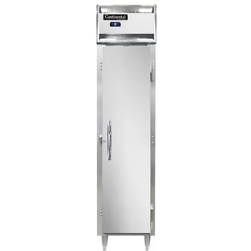 Master your restaurant's kitchen with the Continental Refrigerator D1RSENSS* Reach-In Refrigerator. This designer slim line refrigerator is perfect for commercial restaurant use, offering a narrow full-height solid door and a standard depth cabinet. The stainless steel exterior and interior not only provide durability but also give your kitchen a sleek and professional look. With self-contained refrigeration and electronic control with a digital display, you can easily monitor and adjust the temperature to ensure your ingredients stay fresh. The hi-low alarm alerts you if the temperature goes outside the desired range, preventing any spoilage. The 6" stainless steel legs provide stability and make it easy to clean underneath. Made in the USA and certified by cETLus and NSF, this reach-in refrigerator is a reliable and high-quality addition to any commercial kitchen. Upgrade your restaurant's refrigeration system with the Continental Refrigerator D1RSENSS* Reach-In Refrigerator.
