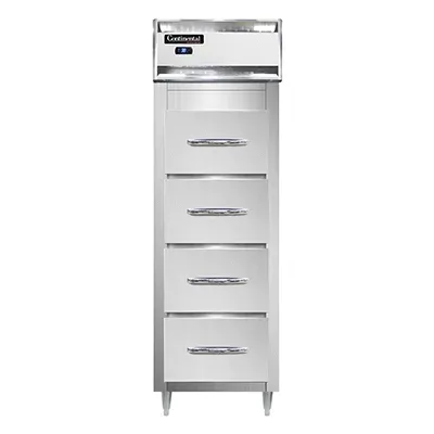 Unleash your kitchen's potential with the Continental Refrigerator D1RSNSS-F Refrigerator, designed specifically for fish and poultry storage. This vertical refrigerated cabinet is part of the Designer Line, boasting a sleek and modern design that will elevate the aesthetics of any commercial restaurant. With its four drawers, you can easily organize and access your fish and poultry inventory, ensuring freshness and efficiency in your kitchen operations. The exterior and interior are made of durable 300 stainless steel, guaranteeing longevity and easy cleaning. The electronic control with a digital display allows for precise temperature management, while the hi-low alarm ensures that your valuable inventory is always kept at the optimal temperature. Made in the USA and certified by cETLus and NSF, this Continental Refrigerator is a reliable and high-quality addition to any professional kitchen. Unleash the full potential of your restaurant with this top-of-the-line refrigeration solution.