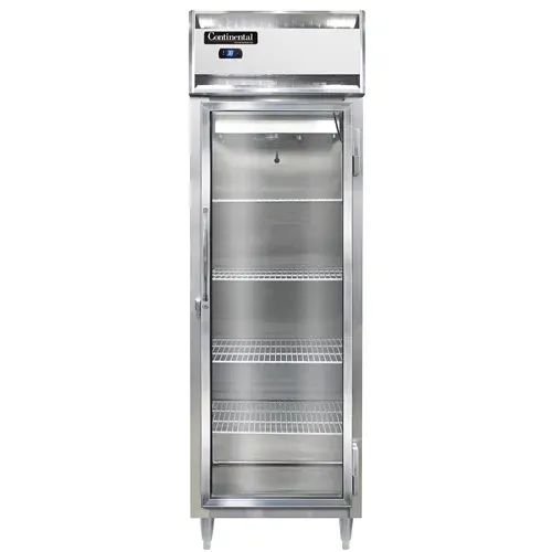 Achieve culinary excellence with the Continental Refrigerator D1RSNSSGD Reach-In Refrigerator. This designer line refrigerator is perfect for commercial restaurant use, offering a spacious 16.0 cu. ft. capacity to store all your ingredients and prepared dishes. The shallow depth cabinet and full-height glass door provide easy access and visibility to your culinary creations. Made in the USA, this refrigerator features a durable stainless steel exterior and interior, ensuring longevity and easy cleaning. The electronic control with a digital display allows for precise temperature management, while the hi-low alarm alerts you to any fluctuations. With 6" stainless steel legs, this refrigerator is stable and easy to move for cleaning purposes. Powered by a 1/3 HP compressor, this unit is energy-efficient and reliable. Trust Continental Refrigerator for quality and performance in your commercial kitchen.