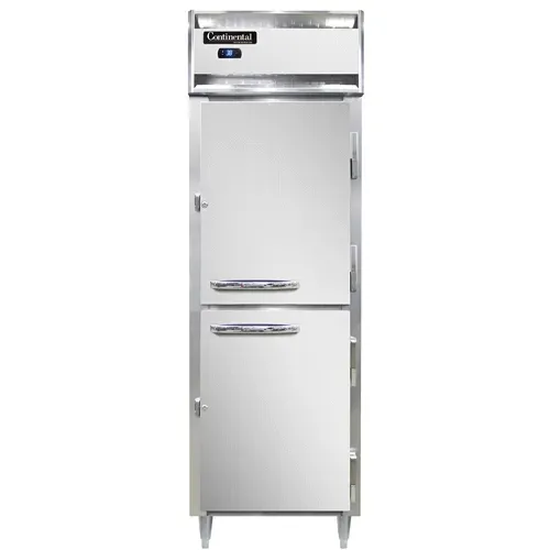 Elevate your dining experience with the Continental Refrigerator D1RSNSSHD Reach-In Refrigerator. This designer line refrigerator is perfect for commercial restaurant use, offering a sleek stainless steel exterior and interior that not only looks professional but is also easy to clean. The shallow depth cabinet and half-height solid doors make it convenient to access and organize your ingredients. With self-contained refrigeration and electronic control with a digital display, you can easily monitor and adjust the temperature to ensure your food stays fresh. The hi-low alarm alerts you if the temperature goes outside the desired range, giving you peace of mind. The 6" stainless steel legs provide stability and make it easy to move the refrigerator for cleaning. Made in the USA and certified by cETLus and NSF, this Continental Refrigerator is a reliable and high-quality choice for any commercial kitchen.
