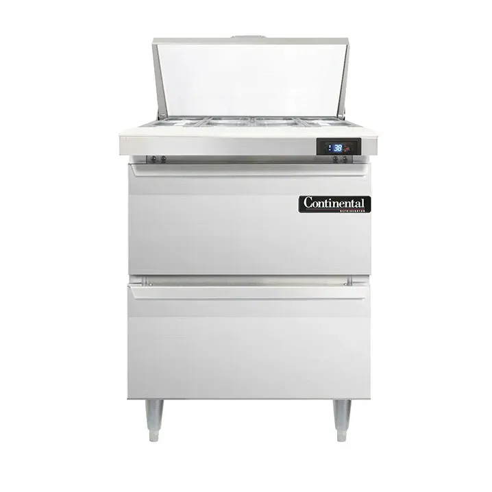 Elevate your dining experience with the Continental Refrigerator D27N8-D Refrigerated Counter, Sandwich / Salad Unit. This designer line sandwich unit is perfect for commercial restaurant use, offering a sleek and functional addition to your kitchen. With its 27" width and one-section design, it provides ample space for your ingredients and supplies. The unit comes with eight 1/6 size x 4" deep pans and a 12" cutting board, allowing for efficient food preparation. Additionally, it features two drawers that can accommodate a 12 x 20 x 6 pan each (supplied by others). The stainless steel top, front, sides, and interior ensure durability and easy cleaning. The electronic control with a digital display and hi-low alarm provide precise temperature management and monitoring. With rear-mounted self-contained refrigeration and 6" adjustable legs, this unit offers convenience and flexibility. Trust in the Continental Refrigerator D27N8-D to enhance your restaurant's efficiency and productivity. Made in the USA, this refrigerated counter is cETLus and NSF certified, guaranteeing its quality and reliability.