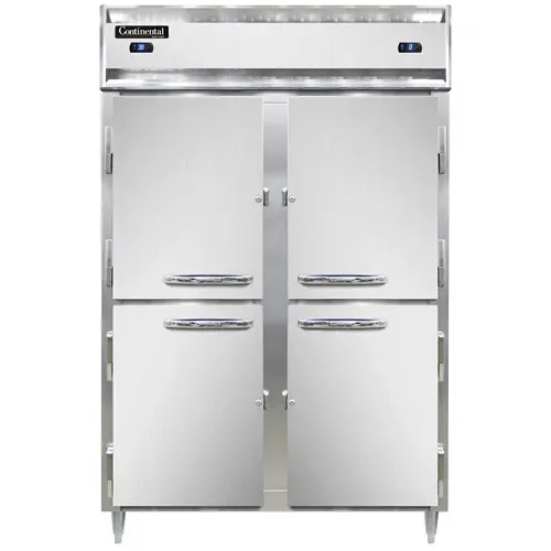 Equip your commercial kitchen with the Continental Refrigerator D2RFNSSPTHD, a top-of-the-line pass-thru refrigerator freezer. This designer line unit is perfect for busy restaurants that require efficient and reliable refrigeration. With its stainless steel exterior and interior, this refrigerator freezer not only looks sleek but is also easy to clean and maintain. The narrow half-height solid doors provide easy access to the contents while minimizing the amount of space needed for opening and closing. The electronic control with a digital display allows for precise temperature management, ensuring that your food stays fresh and safe. The hi-low alarm alerts you if the temperature goes outside the desired range, preventing any potential spoilage. With dual 1/4 & 1/3 HP compressors, this unit provides powerful and consistent cooling. Trust Continental Refrigerator to deliver high-quality refrigeration solutions for your commercial kitchen.