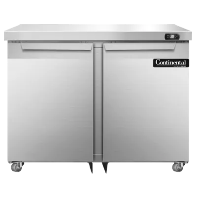 Master the art of flavor with the Continental Refrigerator D36N-U Undercounter Reach-In Refrigerator. This designer line refrigerator is perfect for commercial restaurant use, offering a spacious 36"W two-section design with field rehingeable doors. The stainless steel exterior and interior provide durability and a sleek look, while the stainless steel top adds a convenient workspace. With 1-3/8" diameter plate casters, this refrigerator is easy to move and position wherever you need it. The front breathing design and rear mounted self-contained refrigeration ensure efficient cooling without taking up valuable kitchen space. The electronic control with digital display allows for precise temperature management, while the hi-low alarm alerts you to any temperature fluctuations. Made in the USA and cETLus certified, this Continental Refrigerator is a reliable and high-quality addition to any commercial kitchen.