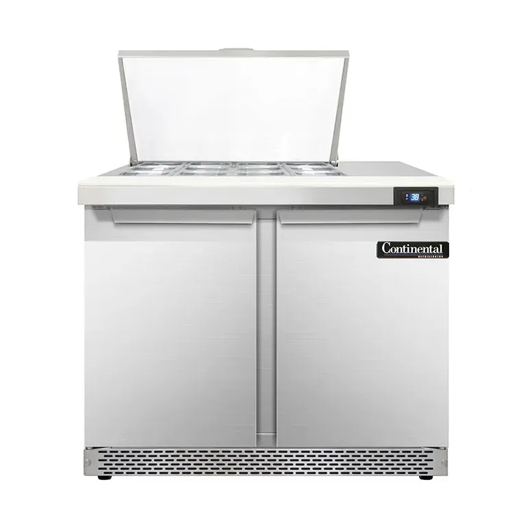 Fuel your restaurant's success with the Continental Refrigerator D36N12M-FB Refrigerated Counter, Mega Top Sandwich / Salad Unit. This designer line mighty top sandwich unit is perfect for commercial restaurant use. With its front breather and stainless steel construction on the top, front, sides, and interior, this unit is built to withstand the demands of a busy kitchen. The unit features two sections, with twelve 1/6 size pans that are 4" deep, along with a spacious 10" cutting board for easy food preparation. The two field rehingeable doors provide convenient access to the unit's contents. The electronic control with a digital display allows for precise temperature management, while the hi-low alarm ensures food safety. The rear-mounted self-contained refrigeration system, powered by a 1/5 hp motor, keeps your ingredients fresh and ready for use. With its mobility-enhancing 3-3/4" casters, this unit can be easily moved around the kitchen as needed. Trust Continental Refrigerator to deliver reliable and efficient refrigeration solutions for your restaurant.