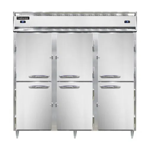 Discover kitchen perfection with the Continental Refrigerator D3RRFNPTHD Refrigerator Freezer. This designer line pass-thru unit is a must-have for any commercial restaurant. With its three-section design and self-contained refrigeration system, this refrigerator freezer offers ample storage space for all your perishable items. The aluminum exterior and interior, along with the stainless steel front and doors, ensure durability and easy cleaning. The narrow half-height solid doors provide easy access to your products while maintaining temperature control. The electronic control with a digital display allows for precise temperature adjustments, while the hi-low alarm alerts you to any fluctuations. With dual 1/3 and 1/3 HP compressors, this unit ensures efficient cooling and freezing. Whether you're storing fresh ingredients or frozen goods, the Continental Refrigerator D3RRFNPTHD Refrigerator Freezer is the perfect addition to your commercial kitchen.
