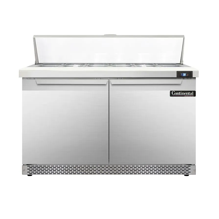 Streamline your restaurant cooking operations with the Continental Refrigerator D48N12-FB Refrigerated Counter, Sandwich / Salad Unit. This designer line sandwich unit is perfect for commercial restaurant use, offering a spacious 48"W two-section design. It comes with (12) 1/6 size x 4" deep pans and a convenient 12" cutting board, allowing you to easily prepare and assemble sandwiches and salads. The unit features two field rehingeable doors, ensuring easy access to your ingredients. Made in the USA, this sandwich unit is built to last with its stainless steel top, front, sides, and interior. The electronic control with a digital display and hi-low alarm provide precise temperature management and peace of mind. With rear-mounted self-contained refrigeration and 3-3/4" casters, this unit is both efficient and mobile. Trust Continental Refrigerator to deliver quality and reliability for your restaurant needs.
