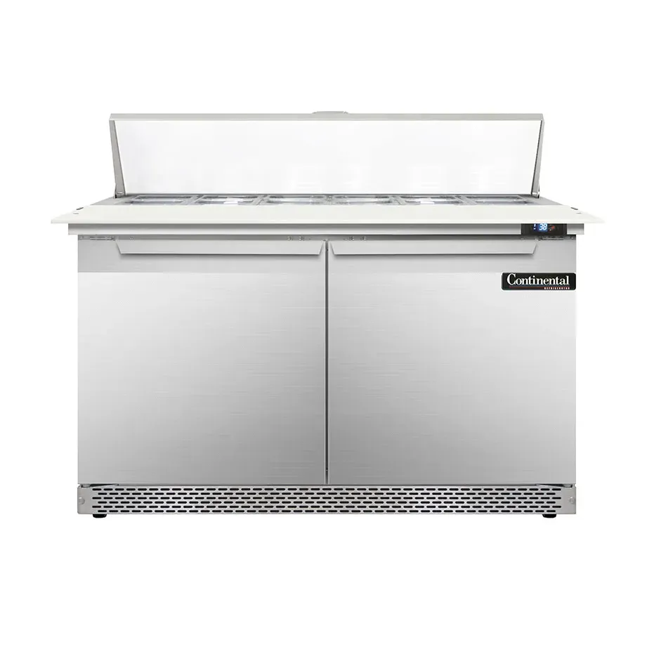 Mobilize your kitchen with the Continental Refrigerator D48N12C-FB Refrigerated Counter, Sandwich / Salad Unit. This designer line sandwich unit is perfect for commercial restaurant use, offering a spacious 48" width and two sections to accommodate your culinary needs. With twelve 1/6 size pans that are 4" deep and a convenient 19" cutting board, you'll have plenty of space to prepare and store your ingredients. The unit features two field rehingeable doors, allowing for easy access and flexibility in your kitchen layout. Made in the USA, this sandwich unit is built to last with its stainless steel top, front, sides, and interior. The electronic control with a digital display and hi-low alarm ensures precise temperature control and food safety. With rear-mounted self-contained refrigeration and 3-3/4" casters, this unit is easy to move and position in your kitchen. Trust Continental Refrigerator for reliable and efficient refrigeration solutions.