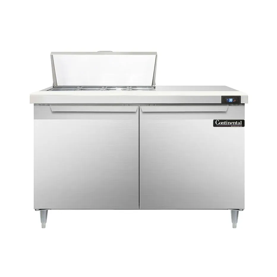 Achieve kitchen supremacy with the Continental Refrigerator D48N8 Refrigerated Counter, Sandwich / Salad Unit. This designer line sandwich unit is a must-have for any commercial restaurant. With its spacious 48" width and two-section design, it offers ample storage and organization for your ingredients. The unit comes with eight 1/6 size x 4" deep pans and a 12" cutting board, allowing you to easily assemble sandwiches and salads with precision. The stainless steel top, front, sides, and interior not only provide durability but also give the unit a sleek and professional look. The electronic control with a digital display and hi-low alarm ensures precise temperature control and alerts you if there are any fluctuations. The rear-mounted self-contained refrigeration system, powered by a 1/5 hp motor, keeps your ingredients fresh and ready for use. Made in the USA and certified by cETLus and NSF, this Continental Refrigerator unit is a reliable and high-quality addition to your kitchen.