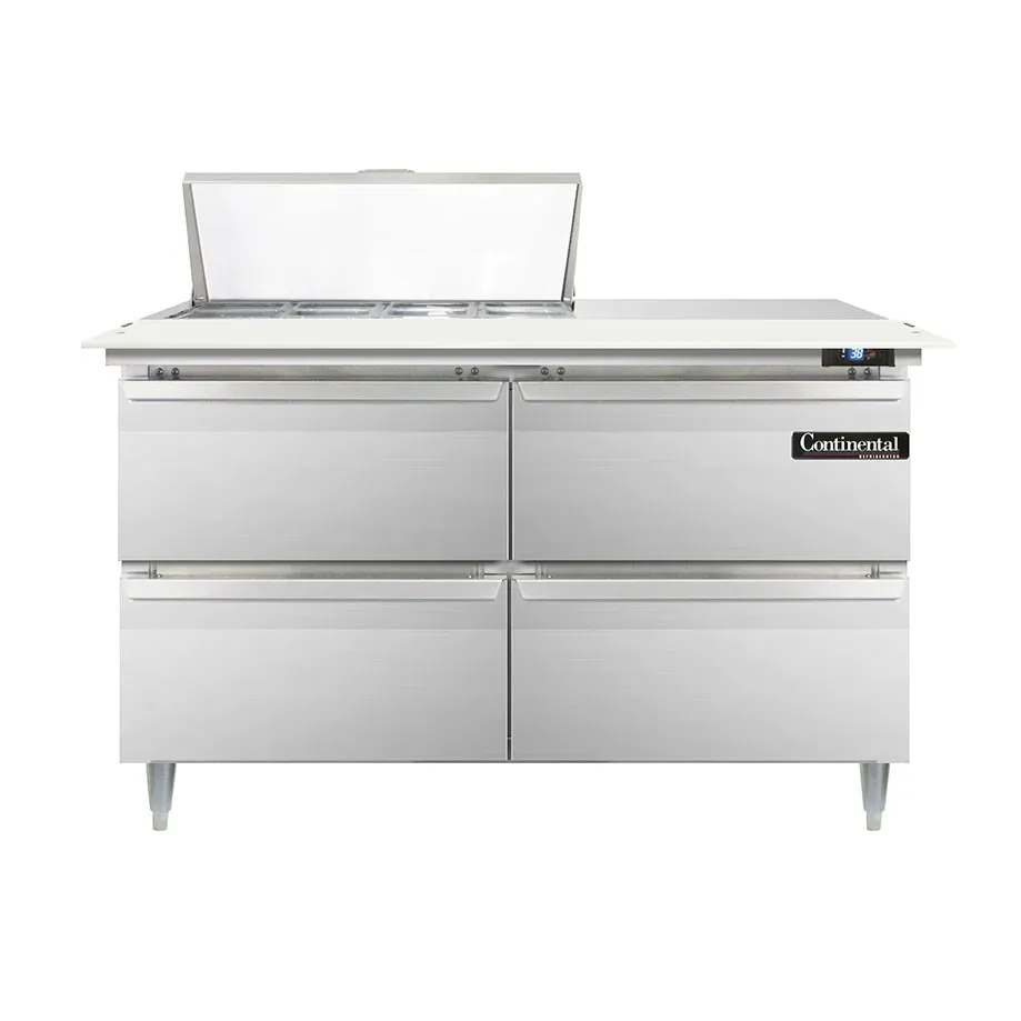 Culinary excellence in every dish starts with the Continental Refrigerator D48N8C-D Refrigerated Counter. This designer line sandwich unit is a must-have for any commercial restaurant. With its spacious 48" width and two-section design, it offers ample storage and preparation space. The unit comes with eight 1/6 size pans, each 4" deep, and a convenient 19" cutting board for easy food preparation. Additionally, it features four drawers that can accommodate a variety of pan sizes, allowing for versatile ingredient storage. The stainless steel construction ensures durability and easy cleaning, while the electronic control with a digital display provides precise temperature management. The hi-low alarm alerts you to any temperature fluctuations, ensuring food safety. With its rear-mounted self-contained refrigeration and 1/5 hp compressor, this unit is both efficient and reliable. Trust in the Continental Refrigerator D48N8C-D to elevate your culinary creations and deliver exceptional dining experiences.