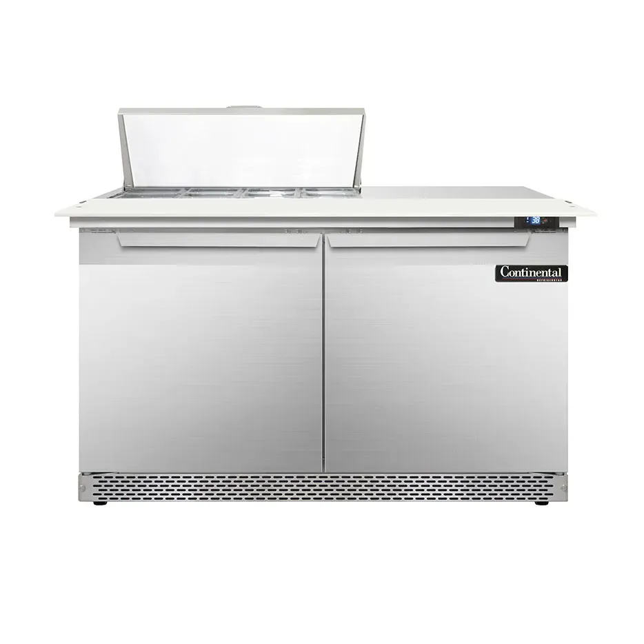Deliver food perfection with the Continental Refrigerator D48N8C-FB Refrigerated Counter, Sandwich / Salad Unit. This designer line sandwich unit is a must-have for any commercial restaurant. With its front breather and stainless steel construction on the top, front, sides, and interior, this unit is built to withstand the demands of a busy kitchen. The unit features two sections, each equipped with eight 1/6 size x 4" deep pans and a 19" cutting board, providing ample space for preparing sandwiches and salads. The two field rehingeable doors make it easy to access the ingredients, while the electronic control with a digital display ensures precise temperature control. The hi-low alarm alerts you if the temperature goes out of range, ensuring food safety. With rear-mounted self-contained refrigeration and 3-3/4" casters, this unit is easy to move and position in your kitchen. Trust in the Continental Refrigerator D48N8C-FB to keep your ingredients fresh and your customers satisfied.
