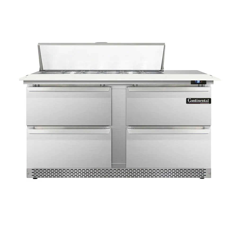 Fuel your restaurant's success with the Continental Refrigerator D60N12C-FB-D Refrigerated Counter, Sandwich / Salad Unit. This designer line sandwich unit is perfect for commercial restaurant use, offering a spacious 60" width and two sections to accommodate your needs. With twelve 1/6 size pans that are 4" deep and a convenient 19" cutting board, you'll have plenty of space to prepare and store your ingredients. The unit also features four drawers that can each hold a 12 x 20 x 6 pan (supplied by others), providing additional storage options. Made in the USA, this sandwich unit boasts a stainless steel top, front, sides, and interior, ensuring durability and easy cleaning. The electronic control with a digital display and hi-low alarm allows for precise temperature management, while the rear-mounted self-contained refrigeration system with a 1/4 HP compressor ensures efficient cooling. With its sleek design and reliable performance, the Continental Refrigerator D60N12C-FB-D is a must-have for any commercial restaurant.