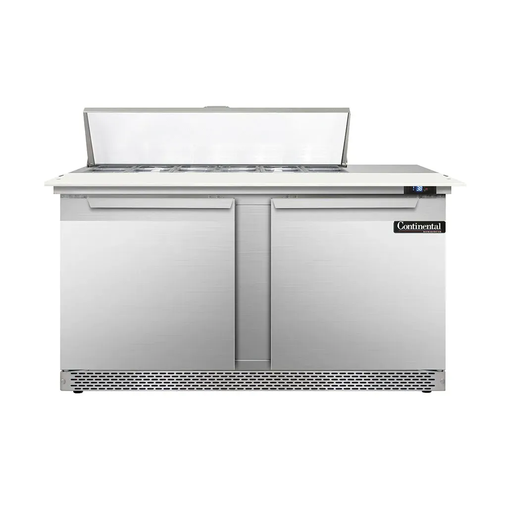 Introducing the Continental Refrigerator D60N12C-FB Refrigerated Counter, Sandwich / Salad Unit, designed to drive restaurant profitability. This two-section sandwich unit is part of the Designer Line, offering both functionality and style. With a spacious 60" width, it features twelve 1/6 size pans, each 4" deep, along with a convenient 19" cutting board for efficient food preparation. The unit is equipped with two field rehingeable doors, allowing for easy access and flexibility in placement. Made in the USA, it boasts a durable stainless steel top, front, sides, and interior, ensuring longevity and easy cleaning. The electronic control with a digital display includes a hi-low alarm, providing precise temperature management and peace of mind. The rear-mounted self-contained refrigeration system, powered by a 1/4 HP motor, ensures optimal cooling performance. With its commercial-grade construction and NSF certification, this Continental Refrigerator unit is a reliable and efficient addition to any restaurant kitchen.