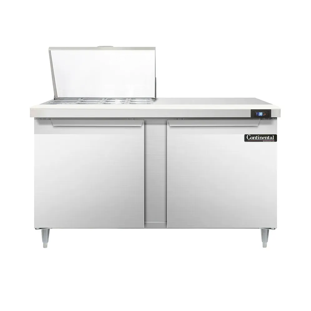 Master your restaurant's kitchen with the Continental Refrigerator D60N12M Refrigerated Counter, Mega Top Sandwich / Salad Unit. This designer line mighty top sandwich unit is perfect for commercial restaurant use. With its spacious 60" width and two-section design, it offers ample storage and organization for your ingredients. The unit comes with twelve 1/6 size pans, each 4" deep, and a convenient 10" cutting board for easy food preparation. The stainless steel construction of the top, front, sides, and interior ensures durability and easy cleaning. The electronic control with a digital display allows for precise temperature management, while the hi-low alarm ensures food safety. The rear-mounted self-contained refrigeration system with a 1/4 HP compressor provides efficient cooling. With its sleek design and adjustable legs, this Continental Refrigerator unit is a must-have for any commercial kitchen.