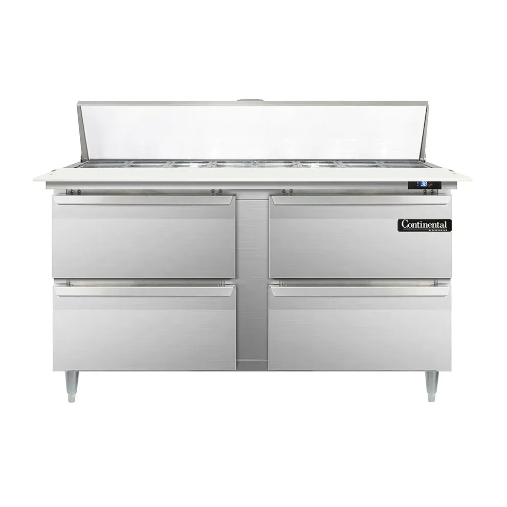 Cook with precision using the Continental Refrigerator D60N16C-D Refrigerated Counter, Sandwich / Salad Unit. This designer line sandwich unit is perfect for commercial restaurant use, offering a spacious 60" width and two sections to accommodate all your ingredients. With 16 1/6 size x 4" deep pans and a 19" cutting board, you'll have plenty of space to prepare delicious sandwiches and salads. The unit also features four drawers, each capable of holding a 12 x 20 x 6 pan (supplied by others), providing convenient storage for your ingredients. Made in the USA, this unit boasts a stainless steel top, front, sides, and interior, ensuring durability and easy cleaning. The electronic control with a digital display allows for precise temperature management, while the hi-low alarm alerts you to any fluctuations. With rear-mounted self-contained refrigeration and 6" adjustable legs, this unit is both efficient and versatile. Trust Continental Refrigerator for quality and reliability in your commercial kitchen.