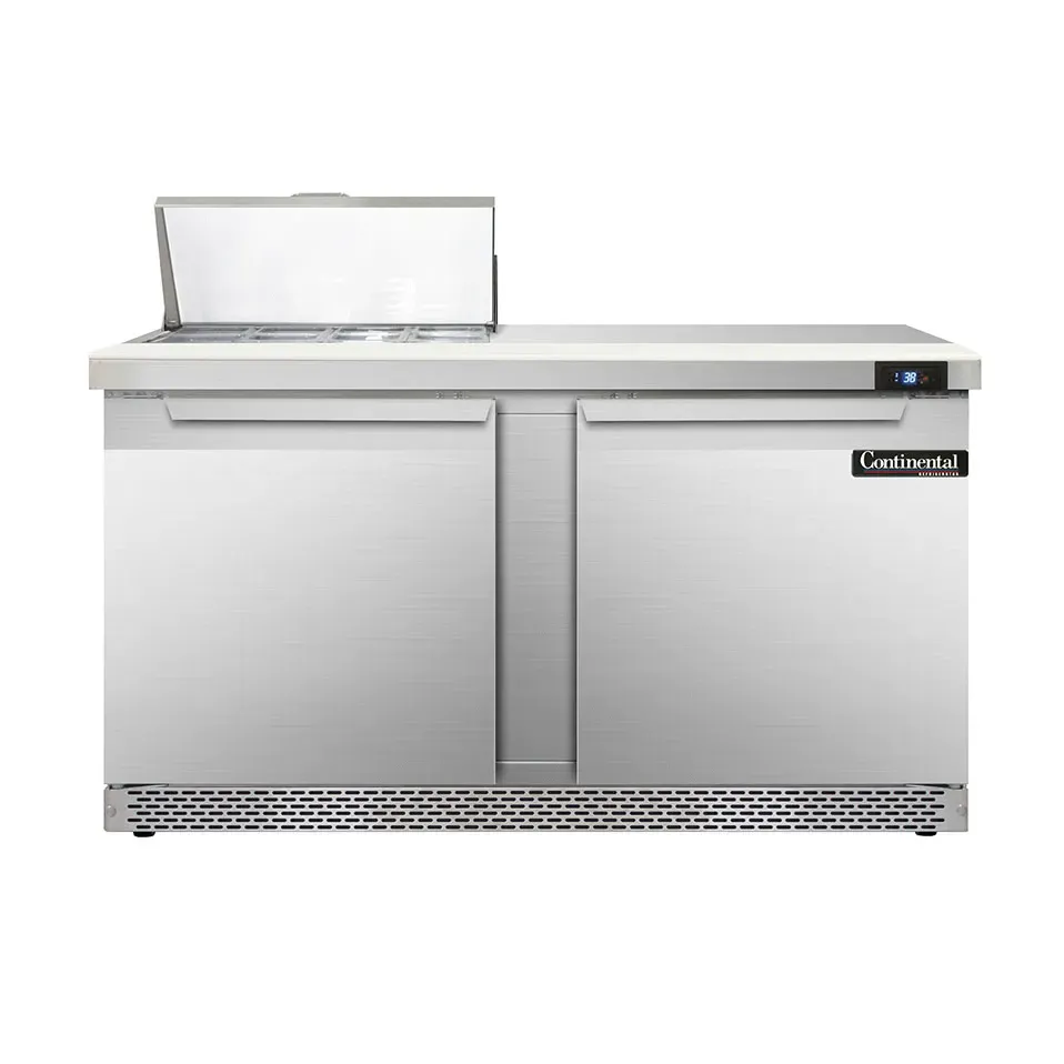 Unleash your kitchen's potential with the Continental Refrigerator D60N8-FB Refrigerated Counter, Sandwich / Salad Unit. This designer line sandwich unit is perfect for commercial restaurant use, offering a spacious 60" width and two sections to accommodate all your food preparation needs. With eight 1/6 size pans that are 4" deep and a 12" cutting board, you'll have plenty of space to store and prepare your ingredients. The unit features two field rehingeable doors, allowing for easy access and flexibility in your kitchen layout. Made in the USA, this sandwich unit is built to last with its stainless steel top, front, sides, and interior. The electronic control with a digital display and hi-low alarm ensures precise temperature control and food safety. With rear-mounted self-contained refrigeration and 3-3/4" casters, this unit is easy to move and position in your kitchen. Trust Continental Refrigerator to deliver quality and reliability for your commercial kitchen needs.