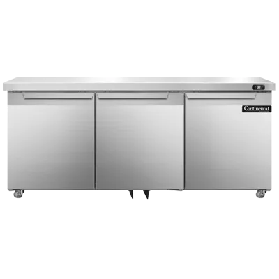 Elevate your dining experience with the Continental Refrigerator D72N-U Undercounter Reach-In Refrigerator. This designer line refrigerator is perfect for commercial restaurant use, offering a spacious 72" width and three sections for ample storage. The three field rehingeable doors allow for easy access and flexibility in placement. Made in the USA, this refrigerator features a durable stainless steel exterior and interior, ensuring longevity and easy cleaning. The stainless steel top provides additional workspace, while the front breathing design allows for built-in or freestanding installation. With an electronic control and digital display, you can easily monitor and adjust the temperature to keep your ingredients fresh. The hi-low alarm alerts you if the temperature deviates from the set range, ensuring food safety. The rear mounted self-contained refrigeration system and 1/4 HP compressor provide efficient cooling. Equipped with 1-3/8" diameter plate casters, this refrigerator is easy to move and position. Trust Continental Refrigerator for reliable, high-quality refrigeration solutions in your commercial kitchen.