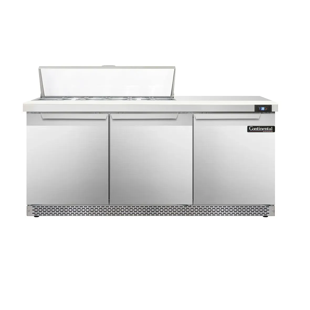 Maximize your food service potential with the Continental Refrigerator D72N12-FB Refrigerated Counter, Sandwich / Salad Unit. This designer line sandwich unit is perfect for commercial restaurant use, offering a spacious 72" width and three sections to accommodate your food preparation needs. With twelve 1/6 size pans that are 4" deep and a convenient 12" cutting board, you'll have plenty of space to create delicious sandwiches and salads. The unit features three field rehingeable doors, allowing for easy access and flexibility in your kitchen layout. Made in the USA, this unit is built to last with its stainless steel top, front, sides, and interior. The electronic control with a digital display and hi-low alarm ensures precise temperature control and food safety. With rear-mounted self-contained refrigeration and 3-3/4" casters, this unit is easy to move and position in your restaurant. Trust Continental Refrigerator for reliable and efficient refrigeration solutions.