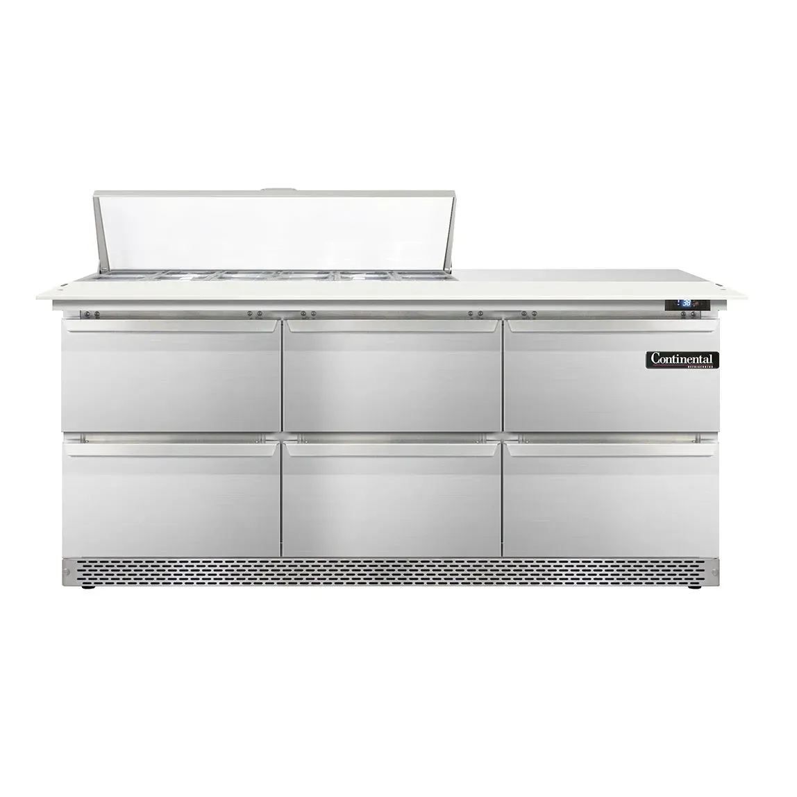 Unleash your inner chef with the Continental Refrigerator D72N12C-FB-D Refrigerated Counter, Sandwich / Salad Unit. This designer line sandwich unit is perfect for commercial restaurant use, offering a spacious 72" width and three sections to accommodate all your culinary needs. With twelve 1/6 size pans and a 19" cutting board, you'll have plenty of space to prepare and store your ingredients. The unit also features six drawers, each capable of holding a 12 x 18 x 6 pan or a combination of 1/2 x 6 and 1/3 x 6 pans. Made in the USA, this unit boasts a stainless steel top, front, sides, and interior for durability and easy cleaning. The electronic control with digital display and hi-low alarm ensure precise temperature control and food safety. With rear-mounted self-contained refrigeration and 3-3/4" casters, this unit is both convenient and efficient. Upgrade your restaurant kitchen with the Continental Refrigerator D72N12C-FB-D Refrigerated Counter, Sandwich / Salad Unit.