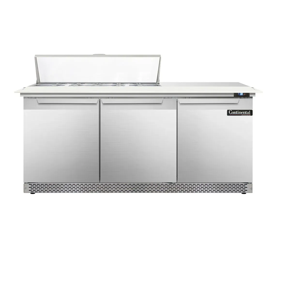 Unleash your kitchen's potential with the Continental Refrigerator D72N12C-FB Refrigerated Counter, Sandwich / Salad Unit. This designer line sandwich unit is perfect for commercial restaurant use, offering a spacious 72" width and three sections to accommodate all your food preparation needs. With twelve 1/6 size pans that are 4" deep and a convenient 19" cutting board, you'll have plenty of space to create delicious sandwiches and salads. The unit features three field rehingeable doors, allowing for easy access and flexibility in your kitchen layout. Made in the USA, this sandwich unit is built to last with its stainless steel top, front, sides, and interior. The electronic control with a digital display and hi-low alarm ensures precise temperature control and food safety. With rear-mounted self-contained refrigeration and 3-3/4" casters, this unit is easy to move and position in your kitchen. Trust Continental Refrigerator to provide you with a reliable and efficient refrigerated counter for your commercial restaurant needs.
