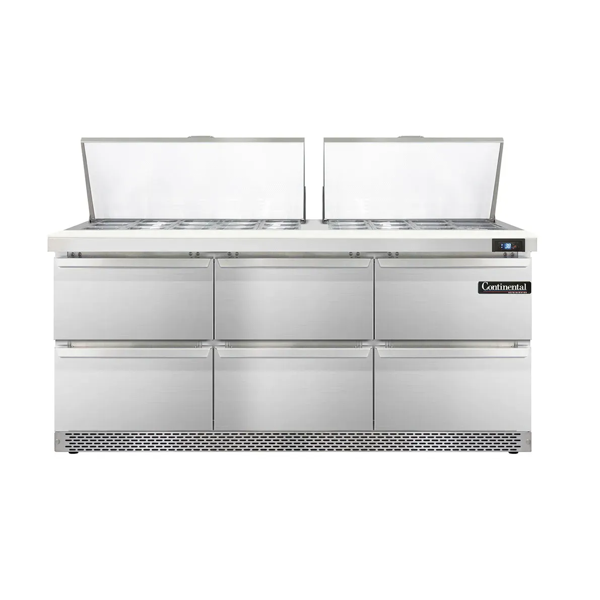 Achieve kitchen supremacy with the Continental Refrigerator D72N27M-FB-D Refrigerated Counter, Mega Top Sandwich/Salad Unit. This designer line mighty top sandwich unit is a game-changer for commercial restaurants. With its spacious 72" width and three-section design, it offers ample storage and organization for your ingredients. The unit comes with 27 1/6 size pans, each 4" deep, and a convenient 10" cutting board for easy food preparation. The six drawers provide additional storage options, accommodating either a 12 x 18 x 6 pan or a combination of 1/2 x 6 and 1/3 x 6 pans. Made with stainless steel on the top, front, sides, and interior, this unit is not only durable but also easy to clean. The electronic control with a digital display and hi-low alarm ensures precise temperature management. With rear-mounted self-contained refrigeration and 3-3/4" casters, this unit is both efficient and mobile. Upgrade your kitchen with the Continental Refrigerator D72N27M-FB-D and experience the ultimate in functionality and performance.