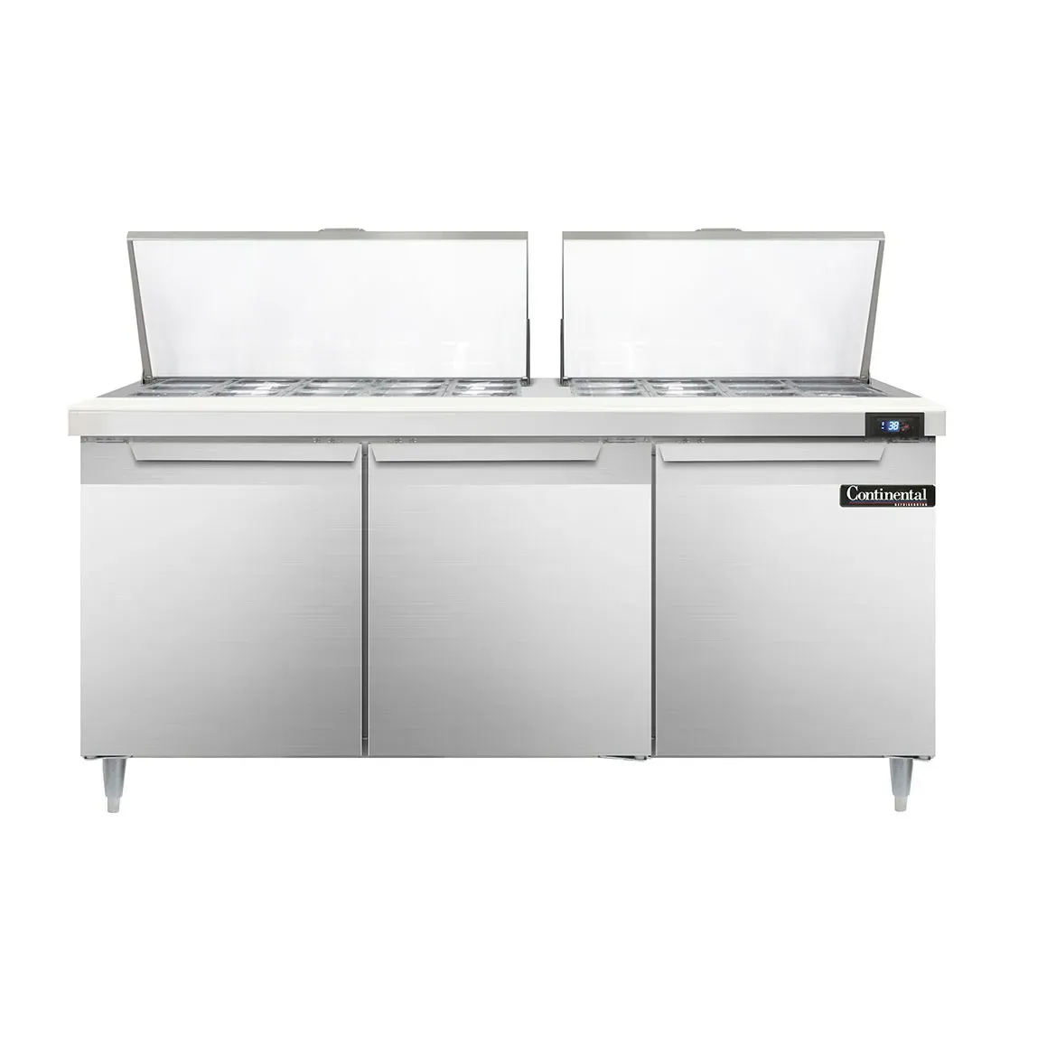 Cook with confidence using the Continental Refrigerator D72N27M Refrigerated Counter, Mega Top Sandwich / Salad Unit. This designer line mighty top sandwich unit is perfect for commercial restaurant use. With its spacious 72" width and three-section design, it offers ample storage and organization for your ingredients. The unit comes with 27 1/6 size pans, each 4" deep, and a convenient 10" cutting board for easy food preparation. The stainless steel construction of the top, front, sides, and interior ensures durability and easy cleaning. The electronic control with a digital display allows for precise temperature management, while the hi-low alarm ensures food safety. The rear-mounted self-contained refrigeration system with a 1/4 HP compressor provides efficient cooling. With its sleek design and adjustable legs, this refrigerated counter will enhance the efficiency and productivity of your commercial kitchen. Trust Continental Refrigerator for reliable and high-quality equipment.