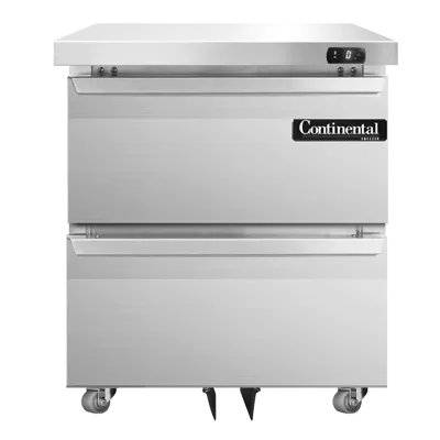 Cooking at its finest begins with the Continental Refrigerator DF27N-U-D Freezer. This undercounter reach-in freezer is a must-have for any commercial restaurant. With its sleek stainless steel exterior and interior, it not only looks professional but is also easy to clean and maintain. The two drawers of this one-section freezer can accommodate a 12 x 20 x 6 pan each, allowing for efficient organization and storage of ingredients. The electronic control with a digital display ensures precise temperature management, while the hi-low alarm alerts you if the temperature deviates from the set range. The rear-mounted self-contained refrigeration system and 1/4 HP compressor provide reliable cooling performance. Equipped with 1-3/8" diameter plate casters, this freezer can be easily moved for cleaning or rearranging. Made in the USA and certified by cETLus and NSF, the Continental Refrigerator DF27N-U-D is a top-quality freezer that will enhance the efficiency and productivity of any commercial kitchen.