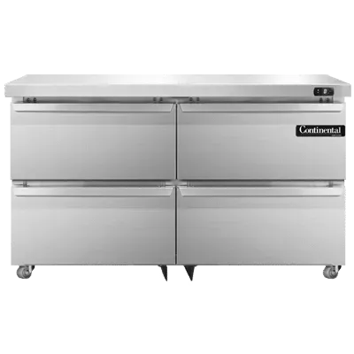 Master the art of cooking with the Continental Refrigerator DF48N-U-D Freezer. This designer line undercounter freezer is a must-have for any commercial restaurant. With its two-section design and four drawers, it offers ample storage space for all your frozen ingredients. Each drawer can accommodate either a 12 x 18 x 6 pan or a combination of a 1/2 x 6 pan and a 1/3 x 6 pan, giving you the flexibility to organize your freezer to suit your needs. The stainless steel exterior and interior ensure durability and easy cleaning, while the stainless steel top provides additional workspace. The front breathing design and rear mounted self-contained refrigeration system make it easy to install and maintain. With its electronic control and digital display, you can easily monitor and adjust the temperature. Plus, the hi-low alarm alerts you if the temperature goes outside the desired range. Made in the USA and certified by cETLus and NSF, this Continental Refrigerator freezer is a reliable and high-quality addition to any commercial kitchen.