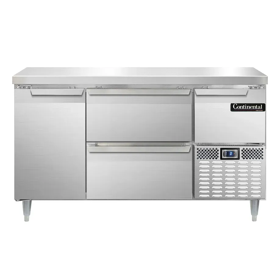 Upgrade your restaurant kitchen with the Continental Refrigerator DFA60NSS-D Freezer Counter. This designer line worktop unit is perfect for commercial restaurant use, offering a spacious 60" width and a reinforced stainless steel worktop for durability and convenience. The stainless steel exterior, front, sides, and interior not only provide a sleek and professional look but also ensure easy cleaning and maintenance. With two drawers and one full-height and one half-height field rehingeable doors, you'll have ample storage space for all your frozen ingredients and products. The electronic control with a digital display allows for precise temperature management, while the hi-low alarm ensures the safety of your perishable items. The side-mounted refrigeration system and 6" adjustable stainless steel legs provide efficient cooling and stability. Made in the USA and certified by cETLus and NSF, this Continental Refrigerator Freezer Counter is a reliable and high-quality addition to any commercial kitchen.