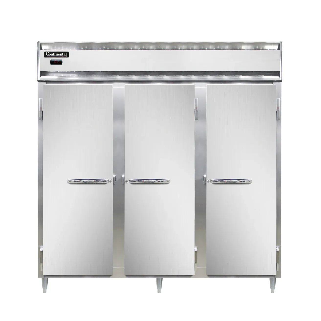 Streamline your restaurant cooking operations with the Continental Refrigerator DL3W-PT Heated Cabinet Pass-Thru. This designer line heated cabinet is perfect for commercial restaurant use, offering convenience and efficiency. The three-section cabinet features an aluminum exterior and interior, ensuring durability and easy cleaning. The stainless steel front and doors add a sleek and professional look to your kitchen. With narrow full-height doors, you can easily access your food items without taking up too much space. The electronic control with a digital display allows for precise temperature management, while the hi-low alarm ensures that your food stays at the optimal temperature. Whether you need to keep your dishes warm before serving or hold food for extended periods, this heated cabinet is a reliable and efficient solution. Trust Continental Refrigerator to provide you with high-quality equipment that meets the demands of a busy commercial kitchen.
