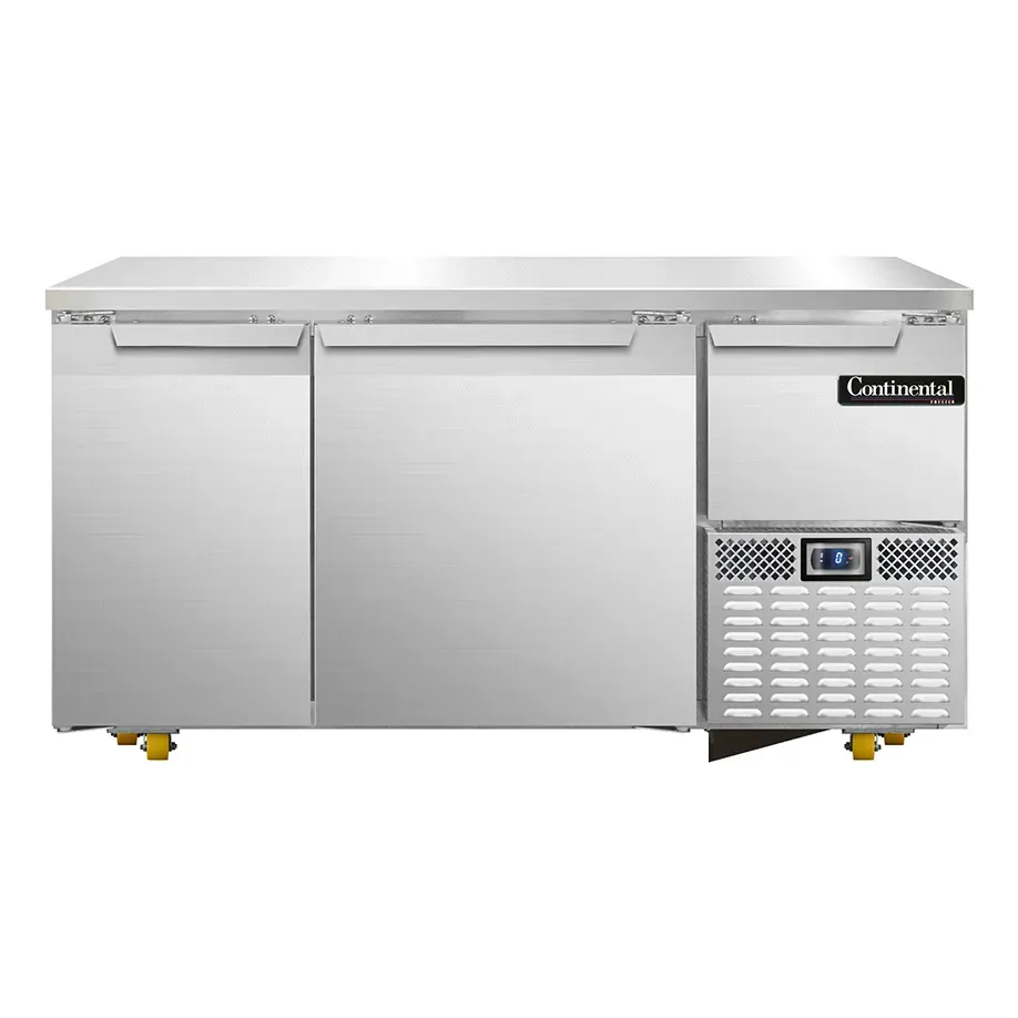 Elevate your culinary experience with the Continental Refrigerator FA60N-U Freezer. This undercounter reach-in freezer is designed to meet the demands of a commercial restaurant setting. With its stainless steel front and end panels, as well as a stainless steel top, this freezer not only looks sleek but is also durable and easy to clean. The aluminum interior provides excellent insulation and ensures that your ingredients stay fresh and frozen. The FA60N-U features two full-height and one half-height field rehingeable doors, allowing for easy access to your frozen goods. The electronic controller with a digital display allows for precise temperature control, ensuring that your food stays at the optimal temperature. With its front breathing and side-mounted refrigeration, this freezer can be conveniently placed in any kitchen layout. The FA60N-U also comes with eight 1-3/8" diameter plate casters mounted on heavy-duty support plates, making it easy to move and install. Made in the USA and certified by cETLus and NSF, this Continental Refrigerator freezer is a reliable and high-quality addition to any commercial kitchen.