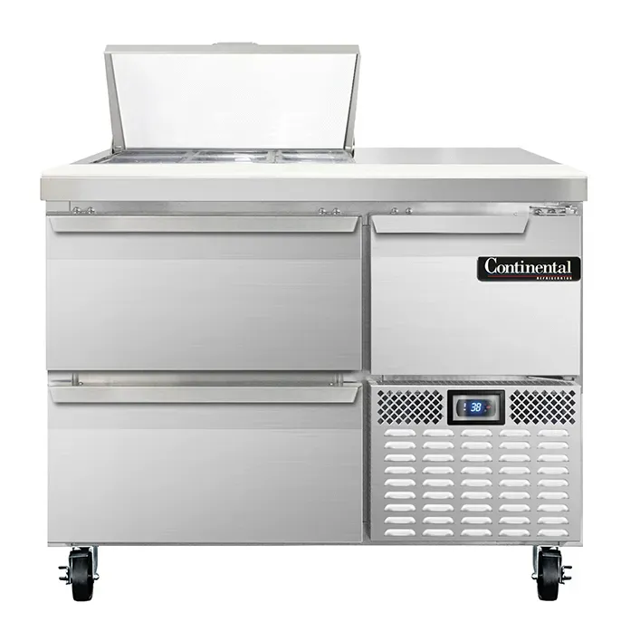 Equip your kitchen for success with the Continental Refrigerator RA43N6-D Refrigerated Counter, Sandwich / Salad Unit. This top-of-the-line unit is designed to meet the demands of a busy commercial restaurant. The 43"W refrigerated base sandwich unit features a durable 300 series stainless steel top with six non-recessed pans, perfect for storing and organizing your ingredients. The stainless steel front and sides, along with the galvanized steel case back, ensure long-lasting durability in a high-traffic kitchen. Inside, you'll find an aluminum interior and a 12" deep nylon cutting board for convenient food preparation. The unit also includes two drawers, with the top drawer holding three 1/6 pans and the bottom drawer holding two 12" x 20" pans. The half-height field rehingeable door and electronic controller with digital display add convenience and ease of use. With a 1/4 hp side-mounted refrigeration system, this unit is both efficient and reliable. Made in the USA and certified by cETLus and NSF, the Continental Refrigerator RA43N6-D is the perfect addition to any commercial kitchen.