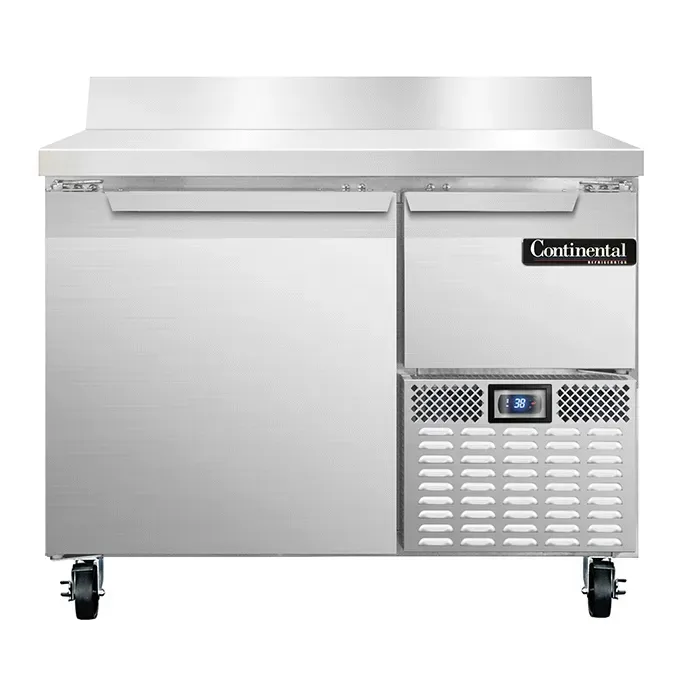 Empower your kitchen staff with the Continental Refrigerator RA43NBS Refrigerated Counter Work Top. This top-of-the-line unit is designed to meet the demands of a busy commercial restaurant kitchen. With its 300 series stainless steel work top and 5-1/2"H backsplash, it provides a durable and sanitary surface for food preparation. The stainless steel front and end panels, along with the galvanized steel rear and grill, ensure long-lasting performance. The aluminum interior is easy to clean and maintain. The unit features one full and one half-height field rehingeable doors, allowing for easy access to stored items. The electronic controller with a digital display ensures precise temperature control. With a 1/4 hp side-mounted refrigeration system, this unit provides efficient cooling while saving valuable kitchen space. NSF and cETLus certified, this Made in USA product is a reliable and essential addition to any commercial kitchen.