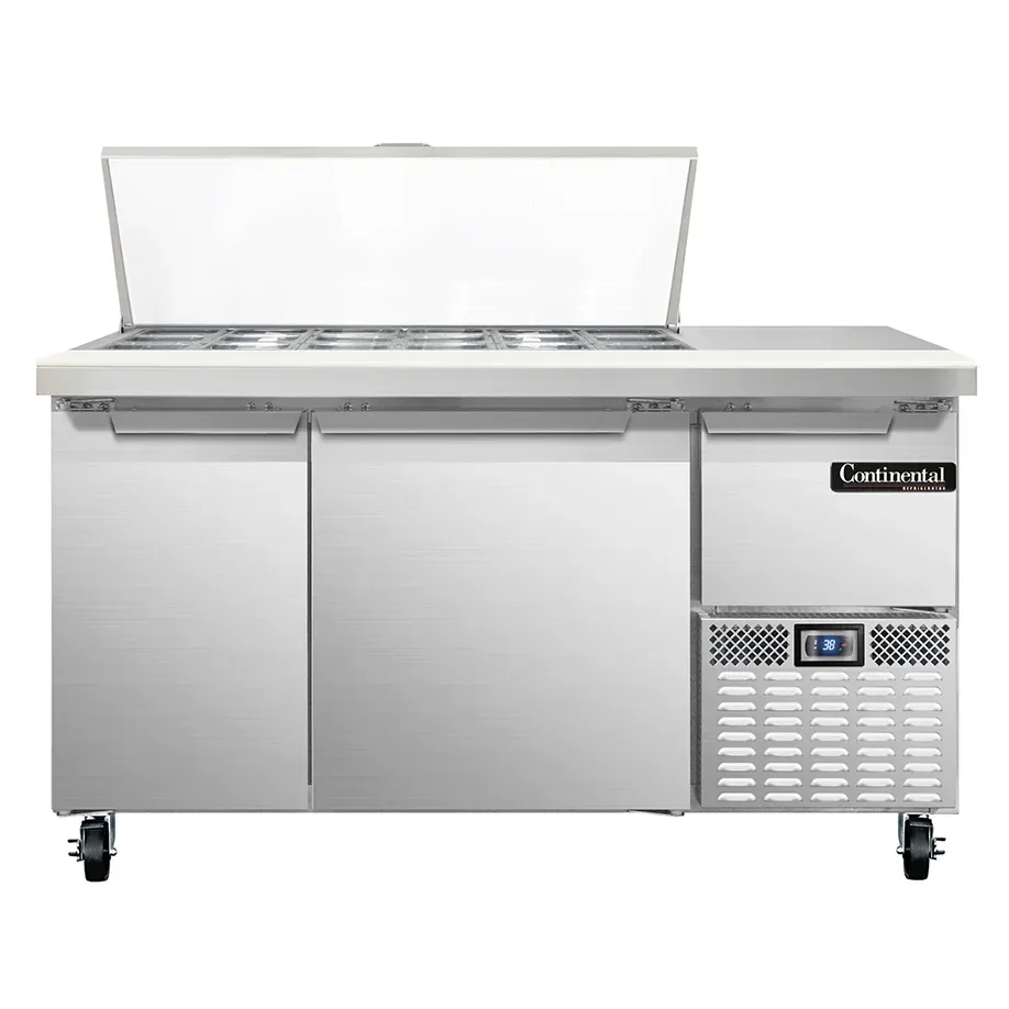 Master the art of cooking with the Continental Refrigerator RA60N18M Refrigerated Counter, Mega Top Sandwich / Salad Unit. This top-of-the-line unit is designed to meet the demands of a busy commercial restaurant kitchen. With its 60" wide refrigerated base, it provides ample space for storing and organizing ingredients. The unit features a durable 300 series stainless steel top with 18 non-recessed pans, allowing you to easily access and display your sandwich and salad ingredients. The stainless steel front and sides, along with the galvanized steel case back, ensure long-lasting durability in a commercial setting. Inside, the aluminum interior is easy to clean and maintain. The unit also comes with a 10" deep nylon cutting board, perfect for preparing fresh ingredients. With its electronic controller and digital display, you can easily monitor and adjust the temperature to keep your ingredients fresh. The side-mounted refrigeration system ensures efficient cooling and easy maintenance. Made in the USA and certified by cETLus and NSF, this Continental Refrigerator unit is a reliable and high-quality addition to any commercial kitchen.