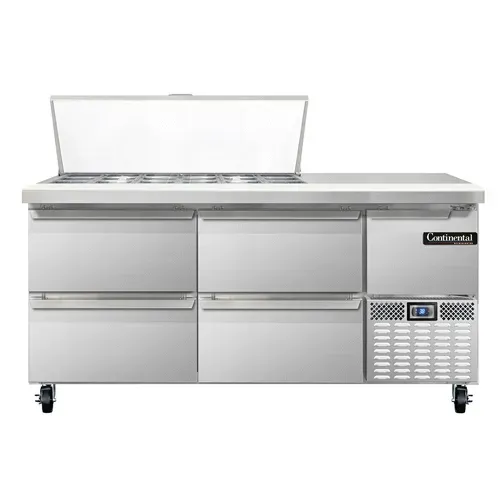 Upgrade your restaurant kitchen with the Continental Refrigerator RA68N18M-D Refrigerated Counter, Mega Top Sandwich / Salad Unit. This top-of-the-line unit is designed to meet the demands of a busy commercial restaurant. With its 68" width and 300 series stainless steel top, it provides ample space for food preparation. The unit comes with 18 non-recessed pans, each 1/6 size and 4" deep, allowing you to store a variety of ingredients for sandwiches and salads. The stainless steel front and sides, along with the galvanized steel case back, ensure durability and easy cleaning. The aluminum interior and 10" deep nylon cutting board add to the unit's functionality. With four drawers, including top drawers that hold one 12" x 20" pan each and bottom drawers that hold two 12" x 20" pans each, you'll have plenty of storage space. The half-height field rehingeable door and electronic controller with digital display provide convenience and ease of use. Powered by a 1/3 HP side-mounted refrigeration system, this unit is both efficient and reliable. Made in the USA and certified by cETLus and NSF, you can trust the quality and safety of this product. Upgrade your kitchen today with the Continental Refrigerator RA68N18M-D Refrigerated Counter, Mega Top Sandwich / Salad Unit.