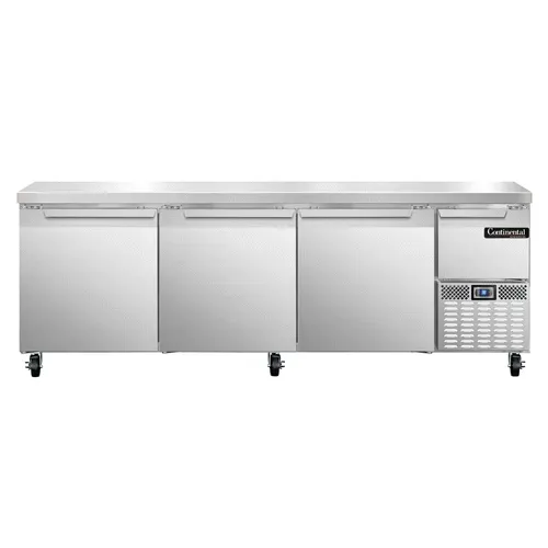 Introducing the Continental Refrigerator RA93N, a top-of-the-line refrigerated counter worktop unit designed to drive restaurant profitability. Made in the USA by Continental Refrigerator, this unit is built to last with its durable 300 series stainless steel flat worktop, stainless steel front and end panels, and galvanized steel rear and grill. The aluminum interior ensures easy cleaning and maintenance, while the electronic controller with digital display allows for precise temperature control. With three full and one half-height field rehingeable doors, this unit provides ample storage space for all your ingredients and supplies. The side-mounted refrigeration system ensures efficient cooling, while the cETLus and NSF certifications guarantee its safety and quality. Whether you're running a bustling restaurant or a busy catering service, the Continental Refrigerator RA93N is the perfect addition to your commercial kitchen, offering reliability, functionality, and convenience.