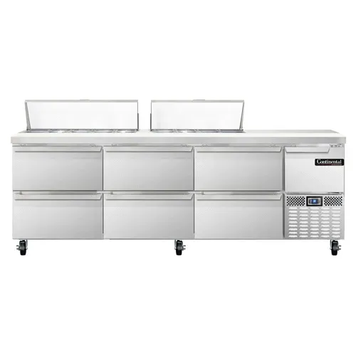 Boost your restaurant's performance with the Continental Refrigerator RA93N18-D Refrigerated Counter, Sandwich / Salad Unit. This top-of-the-line unit is designed to meet the demands of a busy commercial kitchen. The 300 series stainless steel top features 18 non-recessed pans, perfect for storing and organizing your ingredients. The stainless steel front and sides, along with the galvanized steel case back, ensure durability and longevity. Inside, you'll find an aluminum interior and a 12" deep nylon cutting board for easy food preparation. The unit also includes six drawers, with the top drawers holding one 12" x 20" pan each and the bottom drawers holding two 12" x 20" pans each. The half-height field rehingeable door provides easy access to your stored items. With its electronic controller and digital display, you can easily monitor and adjust the temperature. The side-mounted refrigeration system ensures efficient cooling. Made in the USA and certified by cETLus and NSF, this refrigerated counter is a reliable and high-quality addition to any commercial kitchen.