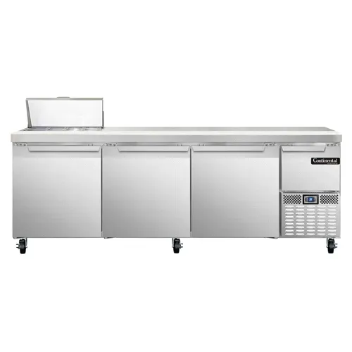 Unleash culinary creativity with the Continental Refrigerator RA93N8 Refrigerated Counter, Sandwich / Salad Unit. This top-of-the-line unit is designed to meet the demands of a busy commercial restaurant kitchen. The 300 series stainless steel top features eight non-recessed pans, allowing for easy access to ingredients while maintaining freshness. The stainless steel front and sides, along with the galvanized steel case back, ensure durability and longevity. Inside, the aluminum interior provides a hygienic and easy-to-clean surface. The unit also includes a 12" deep nylon cutting board, perfect for preparing sandwiches and salads. With three full and one half height field rehingeable doors, organizing and accessing ingredients is a breeze. The electronic controller with digital display allows for precise temperature control, ensuring food safety. Powered by a 1/2 HP side-mounted refrigeration system, this unit is both efficient and reliable. Made in the USA and certified by cETLus and NSF, the Continental Refrigerator RA93N8 is the ideal choice for any commercial restaurant looking to enhance their sandwich and salad preparation.