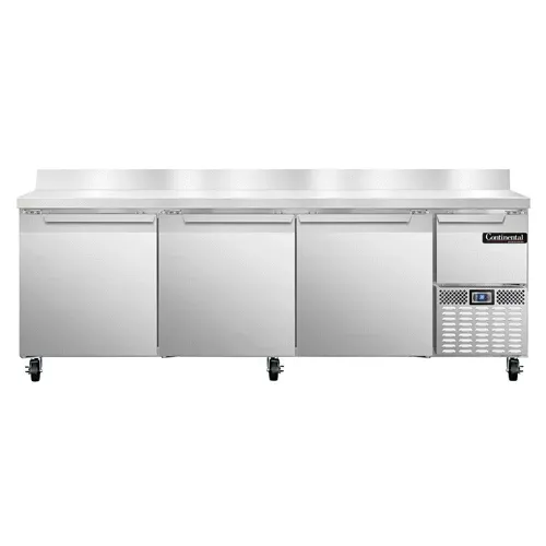 Introducing the Continental Refrigerator RA93NBS, a powerful addition to your commercial kitchen that will help you dominate the culinary world. This refrigerated counter worktop unit is designed to meet the demands of a busy restaurant environment. With its 93" width and stainless steel construction, it offers ample space for food preparation while ensuring durability and easy cleaning. The 5-1/2" high backsplash provides added convenience and prevents spills from reaching the floor. The electronic controller with a digital display allows for precise temperature control, ensuring your ingredients stay fresh and safe. The three full and one half-height field rehingeable doors provide easy access to your stored items. With its side-mounted refrigeration and 1/3 HP compressor, this unit offers efficient cooling without taking up valuable workspace. Made in the USA and certified by cETLus and NSF, the Continental Refrigerator RA93NBS is a reliable and high-quality choice for any commercial kitchen.