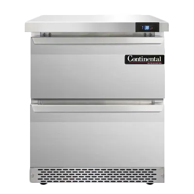 Maximize your food service potential with the Continental Refrigerator SW27N-FB-D Refrigerated Counter. This work top refrigerator is designed to meet the demands of a busy commercial restaurant. With a 7.4 cu ft capacity and a one-section layout, it provides ample space for storing ingredients and prepared dishes. The stainless steel flat top is not only durable but also easy to clean, ensuring a hygienic food preparation area. The two drawers are designed to accommodate a 12 x 20 x 6 pan each, allowing for efficient organization and easy access to ingredients. The electronic control with a digital display and hi-low alarm ensures precise temperature control and alerts you if there are any fluctuations. The rear-mounted self-contained refrigeration system, powered by a 1/5 hp compressor, ensures consistent cooling performance. With its NSF and cETLus certifications, this work top refrigerator is a reliable and safe choice for any commercial kitchen. Trust Continental Refrigerator for quality and durability.