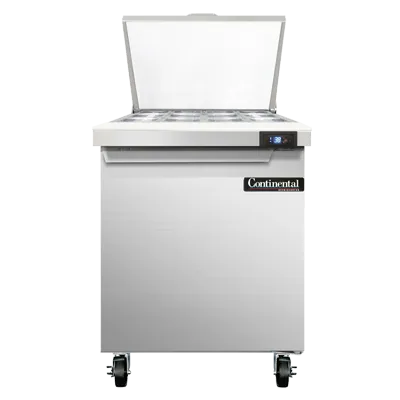 Culinary artistry redefined with the Continental Refrigerator SW27N12M Refrigerated Counter, Mega Top Sandwich / Salad Unit. This mighty top sandwich unit is designed to meet the demands of a busy commercial restaurant kitchen. With a spacious 7.4 cu ft capacity and 12 1/6 size x 4" deep pans, you'll have plenty of room to store and organize your ingredients. The unit features a convenient 10" cutting board for easy food preparation. The stainless steel top, front, and end panels ensure durability and easy cleaning, while the aluminum back and interior provide excellent insulation. The electronic control with a digital display allows for precise temperature management, and the hi-low alarm alerts you if the temperature goes out of range. With rear-mounted self-contained refrigeration and a 1/5 hp compressor, this unit is both efficient and reliable. Made in the USA and certified by cETLus and NSF, you can trust the quality and safety of this refrigerated counter. Upgrade your kitchen with the Continental Refrigerator SW27N12M and experience the difference in performance and convenience.