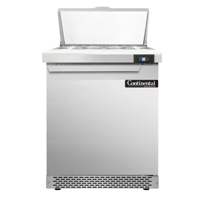 Cook with confidence and flair with the Continental Refrigerator SW27N8C-FB Refrigerated Counter, Sandwich / Salad Unit. This top-of-the-line sandwich unit is designed to meet the demands of a busy commercial restaurant kitchen. With a 7.4 cu ft capacity and eight 1/6 size pans, you'll have plenty of space to store and organize your ingredients. The unit also features a 19" cutting board, allowing you to prep your sandwiches and salads with ease. The stainless steel top, front, and end panels not only give the unit a sleek and professional look, but they also make it easy to clean and maintain. The electronic control with digital display and hi-low alarm ensure that your food stays at the perfect temperature at all times. With its rear mounted self-contained refrigeration and 1/5 hp compressor, this sandwich unit is both efficient and reliable. Trust Continental Refrigerator for all your commercial kitchen needs.