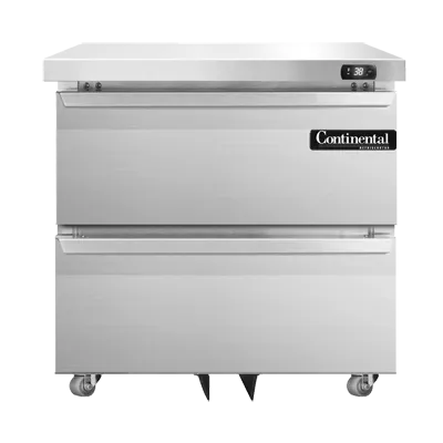 Invest in superior quality with the Continental Refrigerator SW32N-U-D Undercounter Reach-In Refrigerator. This top-of-the-line refrigerator is designed specifically for commercial restaurant use, offering a spacious 9.0 cu ft capacity in a compact 32"W size. The one-section design features two drawers, each capable of accommodating either a 12 x 20 x 6 pan or a 1/2 x 6 pan and two 1/3 x 6 pans. The stainless steel front, top, and end panels provide durability and a sleek appearance, while the aluminum interior ensures easy cleaning and maintenance. With front breathing and rear-mounted self-contained refrigeration, this refrigerator is efficient and reliable. The electronic control with a digital display allows for precise temperature management, and the hi-low alarm ensures food safety. Made in the USA and certified by cETLus, the Continental Refrigerator SW32N-U-D is the perfect addition to any commercial kitchen.