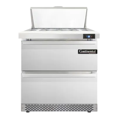 Cook with confidence using the Continental Refrigerator SW32N8C-FB-D Refrigerated Counter, Sandwich / Salad Unit. This top-of-the-line sandwich unit is designed to meet the needs of commercial restaurants, ensuring efficiency and convenience in food preparation. With a 9.0 cu ft capacity and a one-section design, it offers ample space for storing ingredients and preparing sandwiches or salads. The unit comes with eight 1/6 size pans with a 4" depth, along with a 19" cutting board for easy food preparation. Additionally, it features two drawers that can accommodate a variety of pan sizes, providing flexibility in organizing ingredients. The stainless steel top, front, and end panels ensure durability and easy cleaning, while the aluminum back and interior offer excellent insulation. With its electronic control and digital display, you can easily monitor and adjust the temperature, while the hi-low alarm alerts you to any fluctuations. The rear-mounted self-contained refrigeration system and 1/5 hp compressor ensure optimal cooling performance. Trust in the Continental Refrigerator SW32N8C-FB-D to enhance your restaurant's efficiency and productivity.