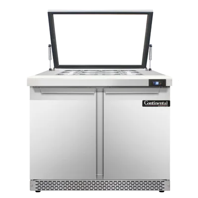 Unleash culinary creativity with the Continental Refrigerator SW36N12M-HGL-FB Refrigerated Counter, Mega Top Sandwich / Salad Unit. This top-of-the-line unit is designed to meet the demands of a busy commercial restaurant kitchen. With its hinged glass lid and front breather, it provides easy access and efficient cooling for your ingredients. The unit features a spacious 36" width and two sections, allowing you to store and organize a variety of ingredients. It comes with twelve 1/6 size pans, each 4" deep, and an 8" cutting board for convenient food preparation. The stainless steel top, front, and end panels ensure durability and easy cleaning, while the aluminum back and interior provide excellent insulation. The electronic control with a digital display and hi-low alarm allows for precise temperature management. With its rear-mounted self-contained refrigeration and 1/5 hp compressor, this unit is both efficient and reliable. Trust Continental Refrigerator for quality and performance. Made in the USA, cETLus and NSF certified.